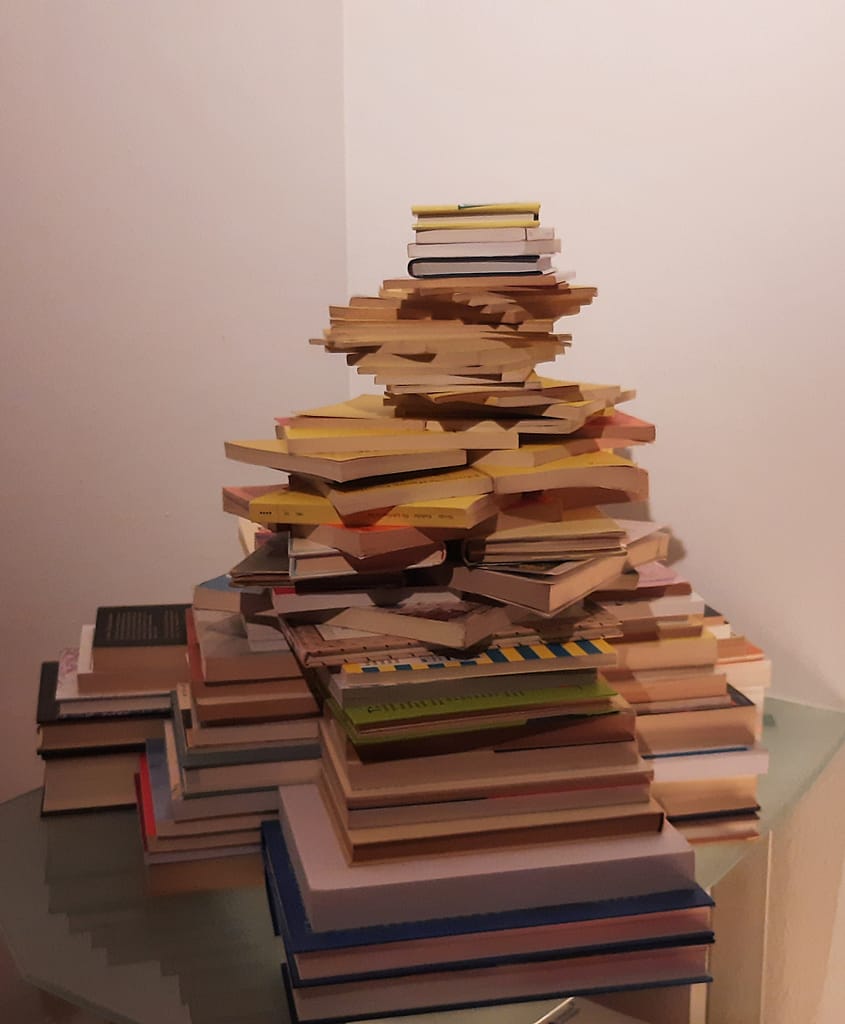 - Indem Du Bücher von unten nach oben in Kegelform aufeinanderlegst, entsteht schrittweise eine baumartige Struktur.