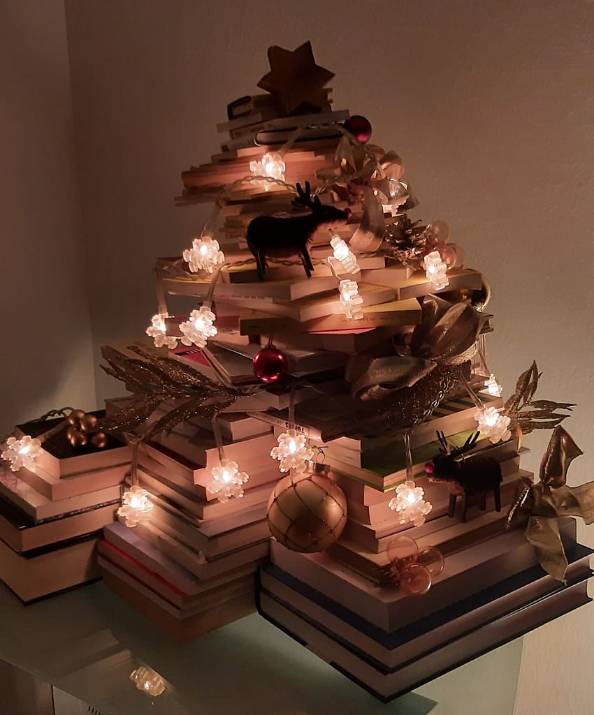 Möglicherweise wirst Du Dich jetzt fragen, wie ein Bücher-Christbaum ausschauen könnte. Daher findest Du hier eine Bauanleitung: